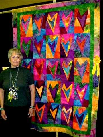 Chopin Batik Hearts - This quilt was made with 27 batik fat quarters. This is the first quilt that I made where I really stepped out of my box with colors. It took me about 3 hours to select the fabrics. I took a class in Fredericksburg, Texas. I made this quilt before I purchased my long arm quilter, so I decided to handquilt it, only later to find out that most quilters DO NOT hand quilt batiks.