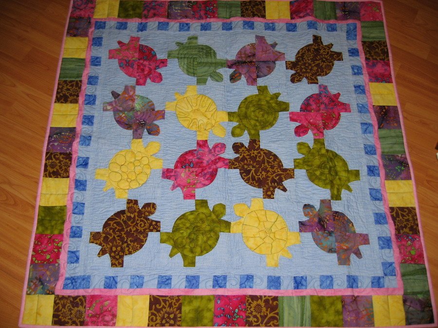 hyacinth Turtle'ing Around - I adopted block design from Quilt Maker magazine but layout is different from that, which is my own layout. I machine quilted it myself.