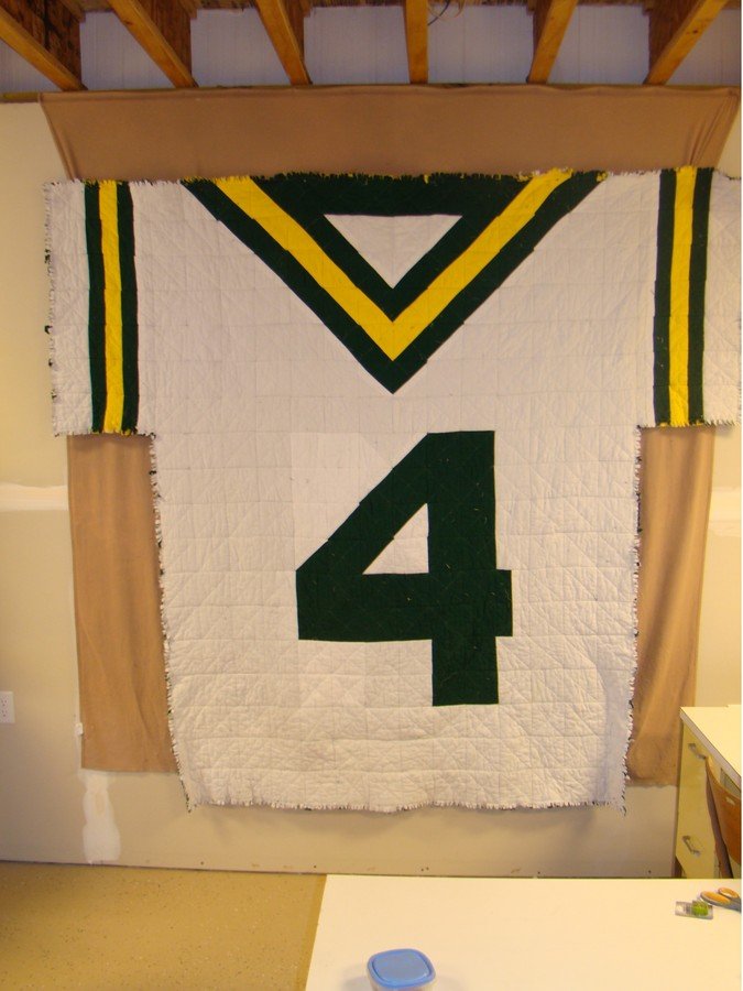 DoriC Brett Farve Rag Quilt - I made this quilt ( and hope to make several more like it) to donate for area charity/fundraisers. Any suggestions on what I can do to not have the number 4 from the other side of the quilt show? See picture of each side.
