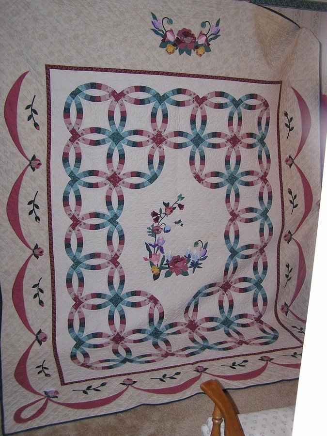 quiltgal52 Anniversary Quilt - This quilt was made for my in-laws for their 50th Wedding anniversary. I love to do applique and am not really fond double wedding ring pattern, so I left the center open for applique that was inspired by a pattern by Nancy Pearson. Of course being from Texas, I had to add bluebonnets to the floral bouquet.