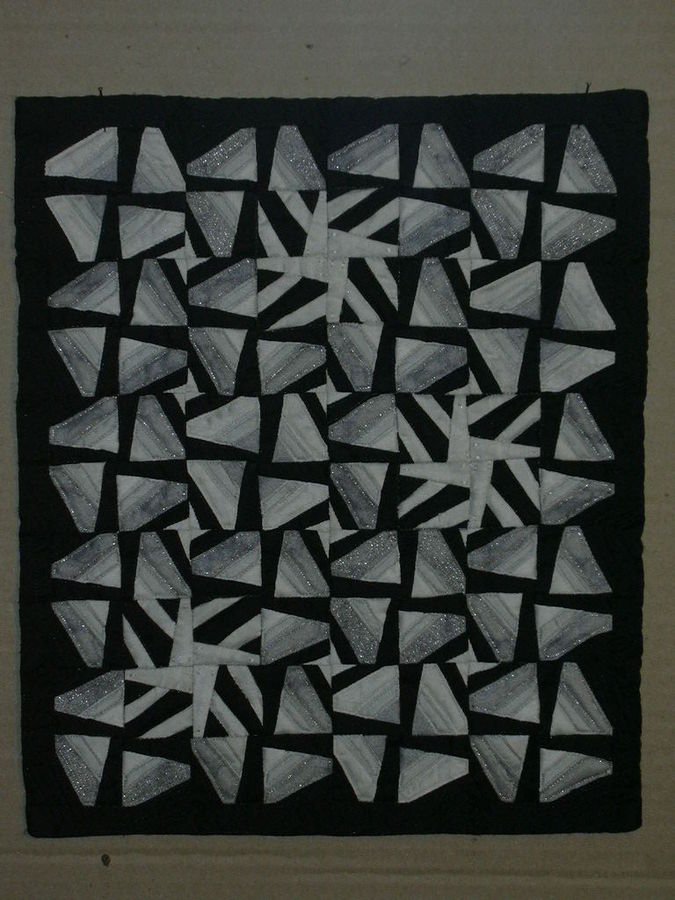 Yjenn Now you see me, Now you don't - Miniature quilt made from 80 x 1 inch blocks, foundation pieced in silks. An original block design inspired by Black and White "Tudor" buildings. Different orientation of fabrics and block rotation provide movement across the quilt top and the "now you see me now you don't" look of the quilt.