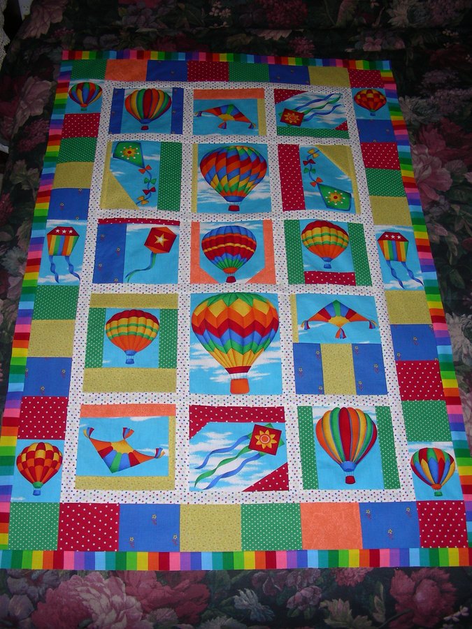 FayIlene Flying High - I am making this quilt for my new Great Nephew, who will arrive in about a month. I wanted to use bright, fun fabrics to brighten his room. I tried to vary the blocks to create more interest. I made the quilt larger than a standard baby quilt because "Baby Hedlund" will probably be taller like his parents.
