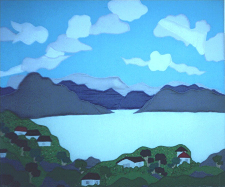 kaytis Serenety "rocky Point" - Size 86 x86. Made of 100 % cotton . Comprised of 16" squares,with a different Embordiery Design in each square. Framed by a yellow border. Theme taken from my late Grandmothers works. All work on this Quilt has been Hand Embroidered,Hand peiced and Hand Quilted.