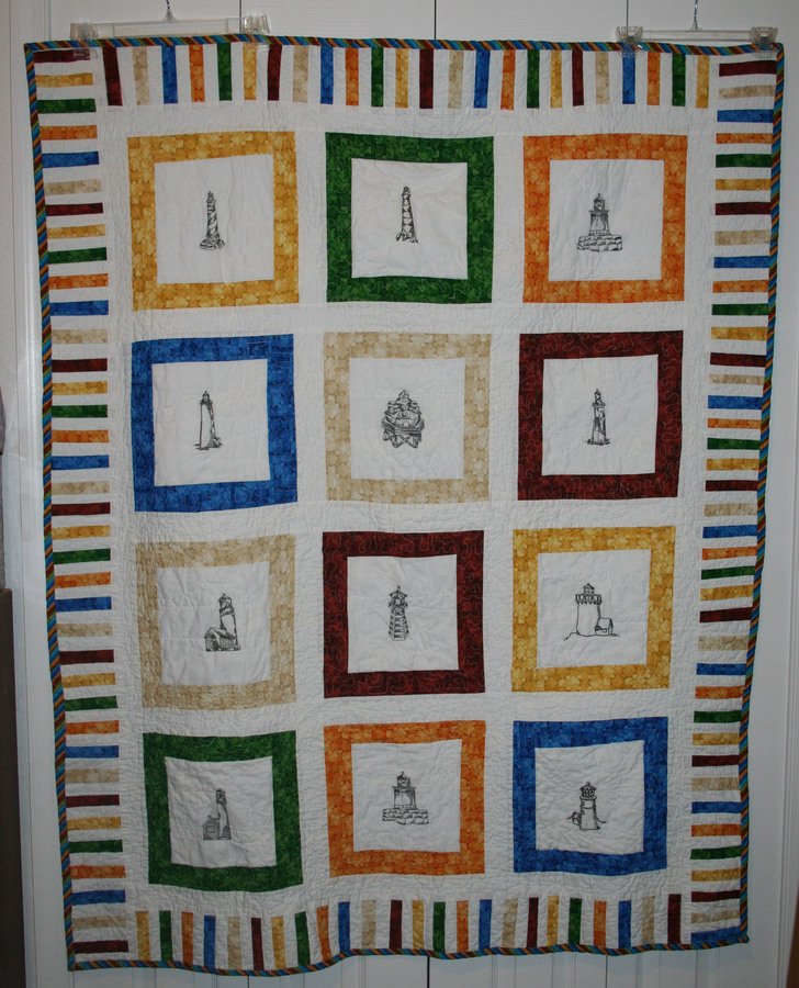 Symantha Lighthouses for Lindy - I used the pattern but added embroidery lighthouses puchased on EBAY instead of the Daisies. The quilt was given to a friend suffering from reast cancer who loves lighthouses.