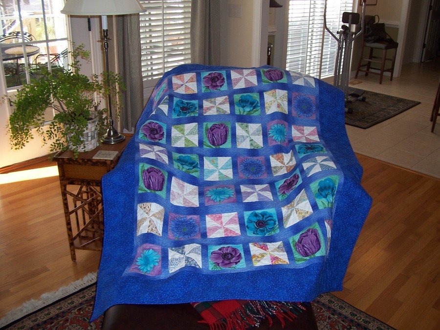 | Design Source - Description | The flowers and sashing are all one piece of fabric. Where the pinwheels are was also a flower which I cut out and then reversed appliqued the pinwheels in the space. |