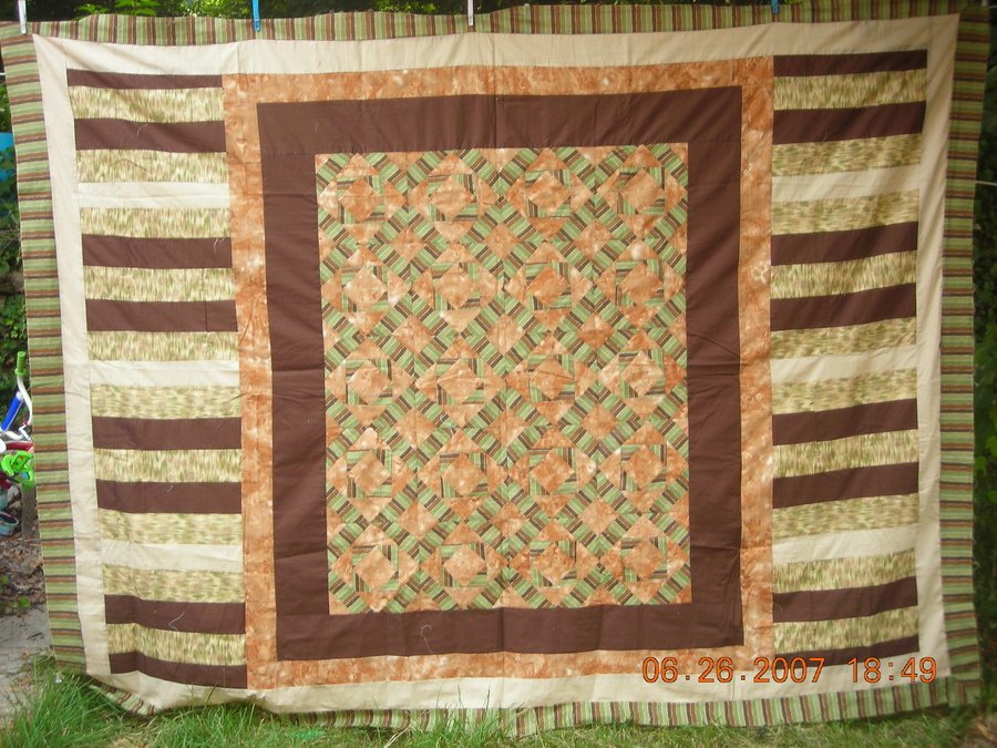 liiddz Papi's Wish - This quilt was made originally as a throw/ Lap size. When I first presented the top to my dad, he enjoyed to see my WIP's, he requested that it be twin sized for his bed. My dad was a strong man whose health deteriorated quickly along with his ability to walk, which was why I had began it as a Lap size. However, as many quilters face the challenge of not having enough fabric on hand to make an entirely second quilt top from the same design. I added the rails on either end to give it length. This quilt is resting with my father in his final resting place. He never got to rest under it when he was here. I finished quilting it during his final stay at the hospital.