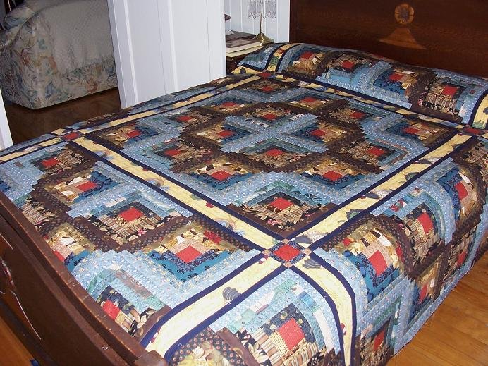 | Design Source - Description | This is a blue and brown log cabin for my husband, Chris. It is split with gorgeous yellow farmyard fabric and Donna has quilted it with "choocks" or chickens. |