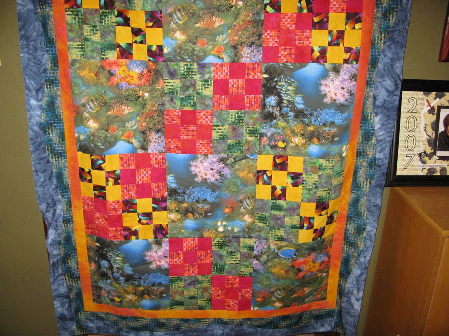 traumaquen1 Honeymoon in Bonaire - I found this wonderful fabric that had underwater scenes on it and it reminded me of the natural beauty that we saw in Bonaire. We went there for our honeymoon and went scuba diving multiple times. We also obtained some fabric from Bonaire that I encorporated into the quilt. On the outside, I did a freestyle wavy cut ( Ricky showed me how) while looks like flowing water around the island. This quilt means a lot to both of us. I still have some quilting to do on it. I want to make it special. It also have some wonderfully hand died Ricky Tims material in it that just brings it alive - ( thanks Ricky and Justin)