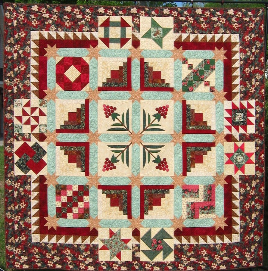 FluffBallQuilts Christmas Sampler - 12 Blocks were from the patterns of my guild's Block of the Month in 2005. The blocks were made from a selection of Christmas fabrics from a "Sweet Treat' pack plus fabrics added as needed. The setting was done on EQ5. Quilting was done by Lynne Turner-Liro on her APQS long-arm.