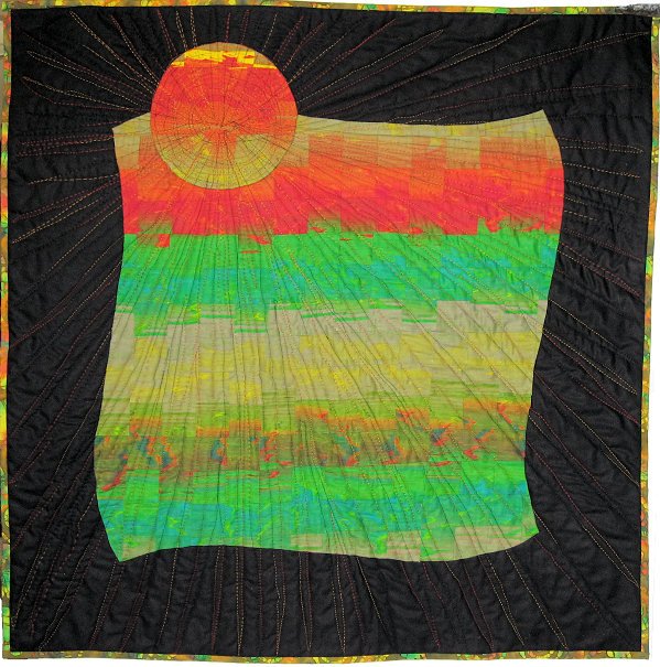 Mirkwood Hideous Kinky - "Hideous" refers to the completely awful fabric colors I started with -- a refugee from a paint factory explosion. "Kinky" refers to the fact that this unfortunate piece of fabric was completely off grain. I wanted to give it an "extreme makeover," and how better than to use Ricky's convergence method? The converged fabric was cut into the wavy and sun shapes and appliquéd to the background. I used variegated rayon thread for quilting and bound with a colorful batik.
