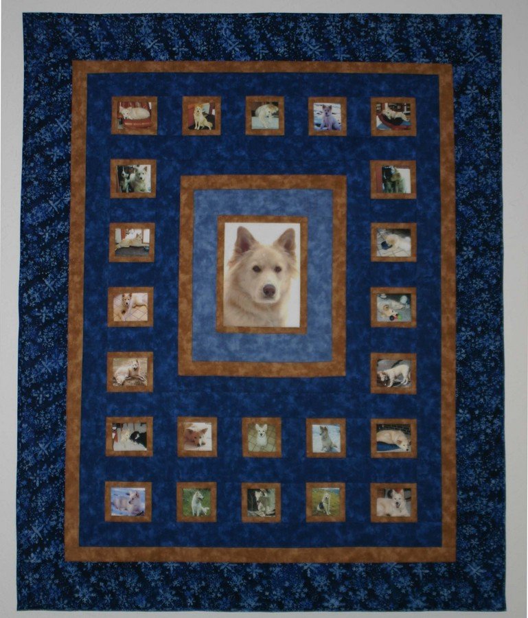 KathyAnn Cheena Memorial - We had gotten our incredible dog, Cheena, from a pound as a baby just 3 years before. One day on their way to a hike in the mountains she died of a congenital heart problem in the backseat of the car. We were beside ourselves. Making this quilt helped me come to terms with her death.