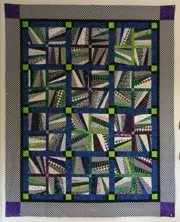 KathyAnn Black and White Dazzle - My best friend, Alice (not a quilter) begged me to take this quilting class with her, which started the next week. They needed another body to fill the class. So, completely unlike myself, both in type of quilt and speed of picking fabrics, I raced around the quilt store and bought everthing I needed in just 1/2 hour. I missed the first meeting so I had to call for directions. In the nexted three weeks of classes I finnished the quilt. A new record for me. My freind never did finish her quilt.