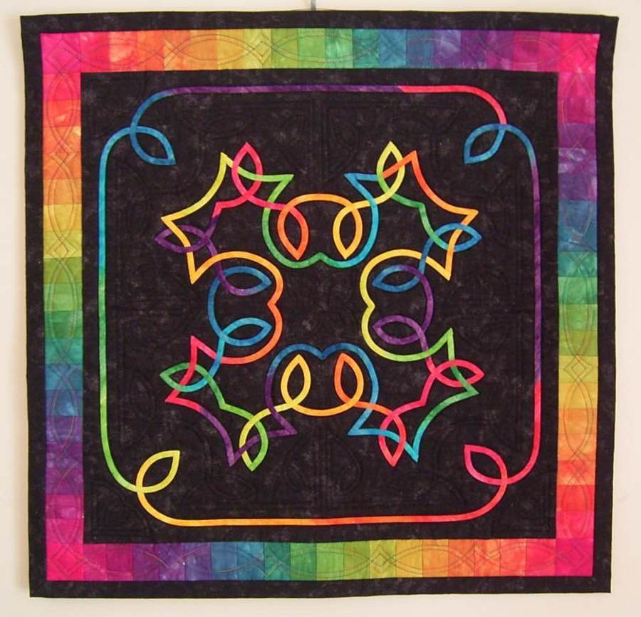 KBinOZ Celtic Rainbow - Result of 2 workshops: Design Your Own Celtic Knot with Gina Burgess, and Fabric Dying with Sandy Corry. Design process is a lot like a Rhapsody quilt.