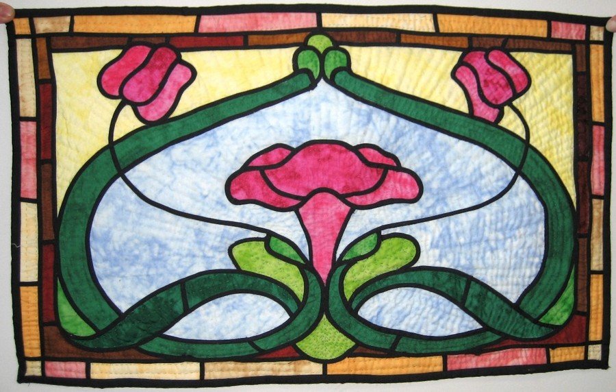 Brita Victorian Stained Glass 1 - This is from a free stained glass window pattern by Chantal Pare. 1/4 inch bias tabe was too wide, so I made my own 1/8 inch bias tape. I have been watching Alex's quilting videos and this is my first hand quilting project. It was supposed to be a Christmas Present for my parents, but I only finished it a little while ago. lol