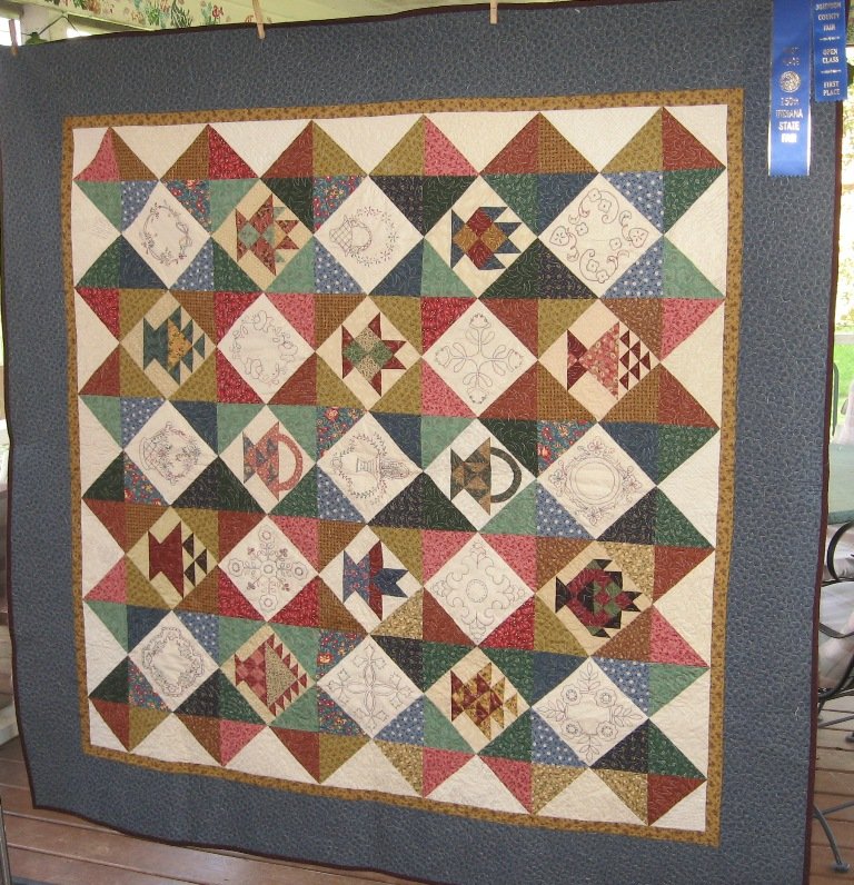 Stiina Mennie's Baskets of Faith, Hope, Love, and Charity - This was a block of the month quilt published by the Back Door Quilts. I also hand embroidered the optional blocks. I then used my own setting pattern, putting the baskets en pointe and using a scrappy, but ordered color set. The quilting was a simple feather, based on Laura Lee Fritz's published pattern.
