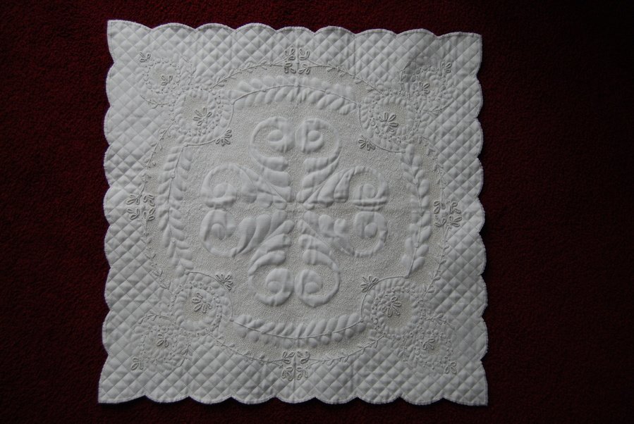 JulieD My Little Antique - I was inspired by Cindy Needham who turned antique linens into beautiful quilts. After watching her on The Quilt Show, I went out and bought this antique linen cutwork applique and decided to make a quilt. The quilting was my own design. I really love how it came out. I used Cindy's scribbling technique to "fill in" areas and make others pop out.