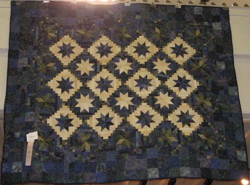 Stiina Northwoods Twilight - This is a pieced quilt using shades of olive greens, creams, and navy blues. It was quilted using flora and fauna reminiscent of Northern Michigan, Hence the "Northwoods" portion of the quilt name.