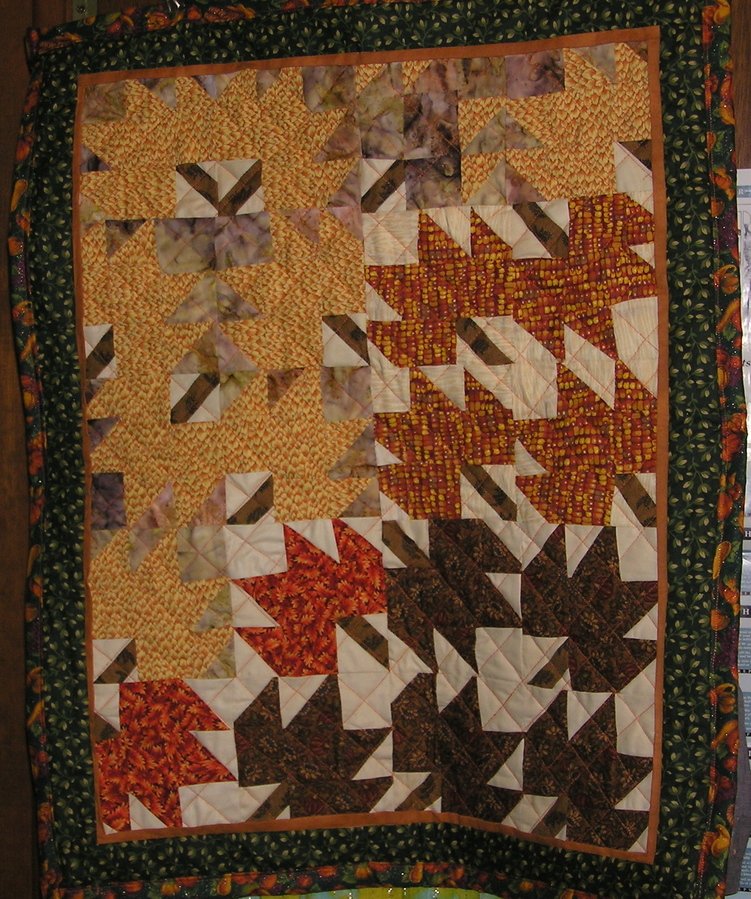 lcarolyn falling leaves before the storm - this was a quilt made for a sub-group of the Sunset Slope Quilters Guild of grand juction, co.. it was made as an example for the group. we were and are all learning different types of quilting techniques. it was fabulous to see the direction we all took, the interpretations were unique. and we had a blast making them and then taking them to show-and-tell. the fabrics used were batiks, which looked like a fall storm threatening the first snow of the season. and various fall looking fabrics with small prints.