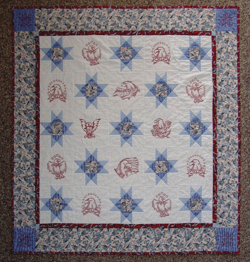 kbskbstango All American - Made for Niece's husband who is former military man with a love of eagles. Eagles were machine embroidered. White area includes embroidered stars. Border and center of star blocks were free motion quilted in star pattern. Hope he likes it!