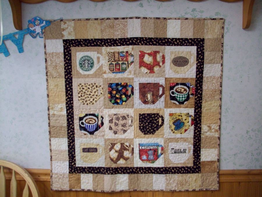 | Design Source - Description | Saw a tea cup wall hanging in Amish Country. I love coffee and thought it'd be cute to remove the saucers and make my wallhanging of coffee cups. The four corners are photo copied pictures of my favorite coffees. |