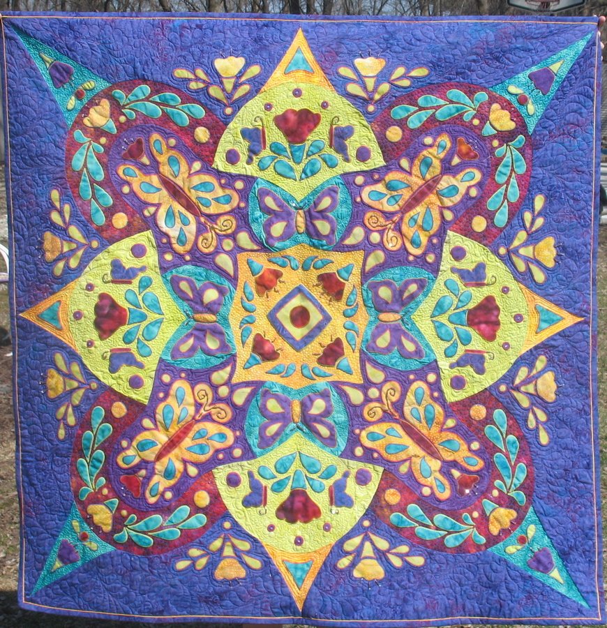 Bridget473 Katelyn's Electric Butterfly Garden - My rhapsody quilt made for my preteen daughter Katelyn. This quilt was started with Ricky's online instruction and completed with the help of his Rhapsody book and Grand Finale DVD. Thanks Ricky! Butterfly and flower details were done by applying beads and crystals by hand. This definitely won't be my last rhapsody quilt!