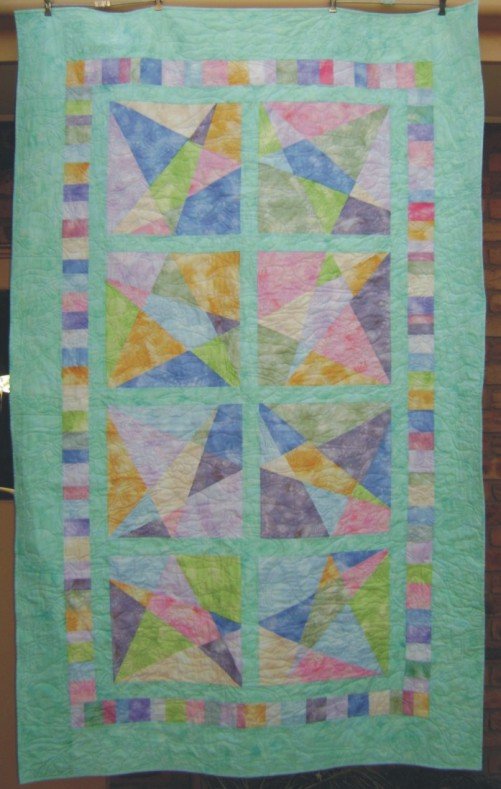 Liesje Stars across Australia - This was made for my Great Niece, Nellie. I had made the star block in a class a few years previously out of pastel Fossil Fern fabric. At the time i thought they were a bit pale and forgot about them. I found them and thought a nice clear pastel blue batic would help to brighten the whole thing up. the quilting is done in a pale mauve and is of Kangaroos, platapus and Tassie tigers. the quilt is going to England and Nellie loves the colours.