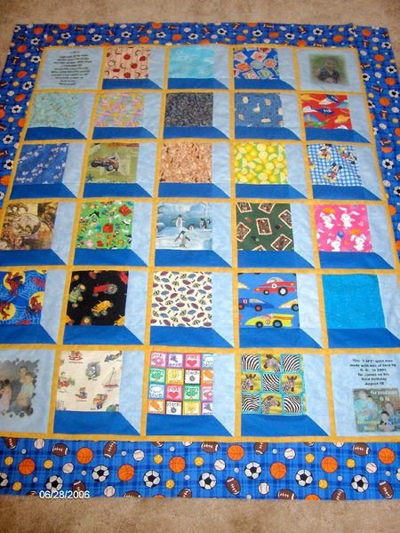 LindaKs I Spy James - I made this with some novelty squares I had received from a swap. One square represents one letter of the alphabet. I also printed his picture and his mom and dad and grandpa & I on treated fabric and added them to the corners along with a list of some of the things to Spy.