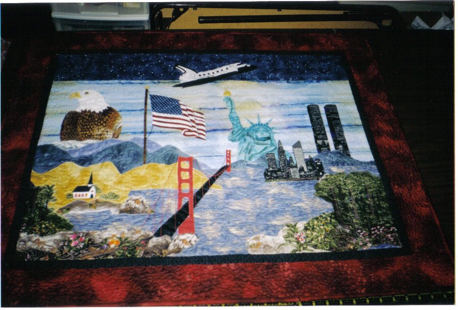 | Design Source - Description | I finished the quilt the day we went to war with Iraq, I wanted all the symbols of what being an American meant to me, and tragedies recently suffered to be in the quilt. Road to Calif 2004 |