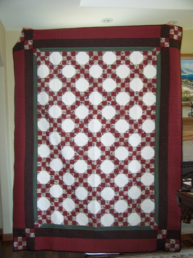 linmcquilter Arkansas Snowball - Started years ago. This is my first attempt at hand-quilting a large size quilt. Wreaths fill the snowball. Nine-patch squares were quilted 1/4" from seam. Green border has a pumpkin-seed design; dark border has feathers; red outside border is done in cross-hatch.