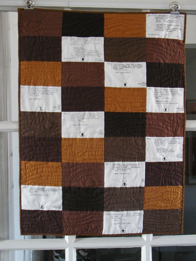 feeddog Card Catalog - My first job was in a library, where I developed an interest in the card catalog cards that were already out of date then. Later I worked as a book editor, so I used the bibliographic data for books I'd worked on to print catalog cards on fabric and sew them into the quilt. The woodgrain pattern on the brown blocks is hand-quilted freehand.