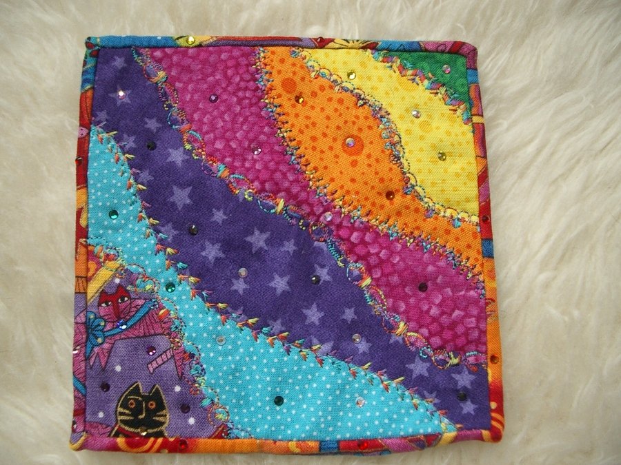 Katiezquiltz Curiositys' Rainbow - "Go Green" was a challenge to buy nothing new for a 5" square quilt. I went to my scraps and found cats and rainbows. I'd just watched TQS and it had a segment on curved pieces and so I tried it out. I added Swaroski crystals and rainbow thread fancy stitches to complete my piece.