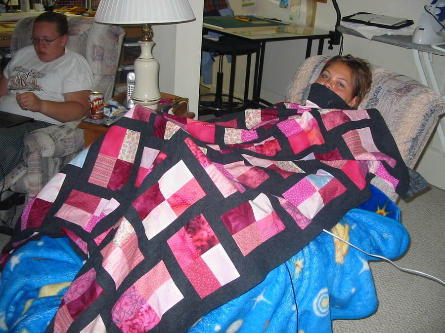 Stitchmouse Not Named yet - This was made at a weekend quilt retreat for my daughter Tiffany. Her favorite colors are black and pink. I went 'shopping' for the pinks in my mom's stash! My mom is quilting it now. Hopefully it will be home soon, my daughter would love to use it! This picture was taken at the retreat right after the top was finished.