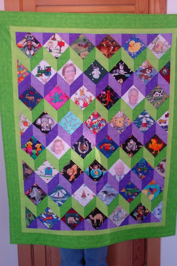 rittmeyer Lilly's First Birthday Quilt - I made this quilt for our grandaughter's first birthday. I put a photo of each of her grandparents in four of the blocks. We live far away and I didn't want her to forget us. I have made a quilt from this pattern for so many new babies and always get a call or a note when the baby is about a year old saying how much fun the baby is having identifying all the objects in the blocks. It's a fun pattern and NO "Y" SEAMS!