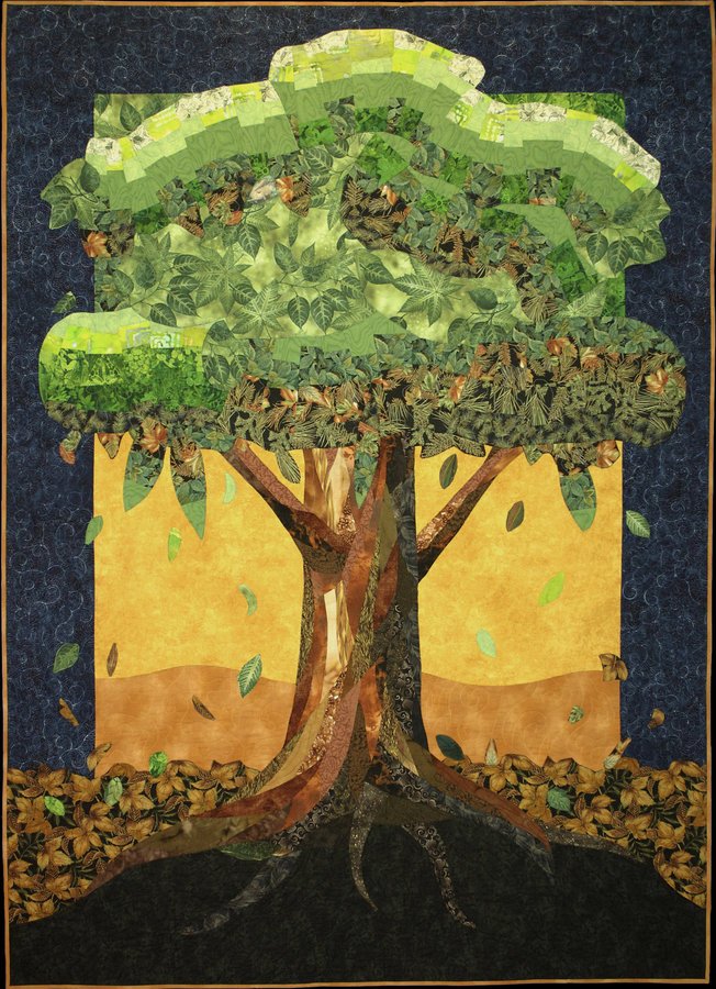 | Design Source - Description | Our youngest daughter’s “collage” quilt; from roots, through the trunk, to an emerging bargello at top, and the leaves shed back to the earth, the fantasy quilt life-cycle is complete. |