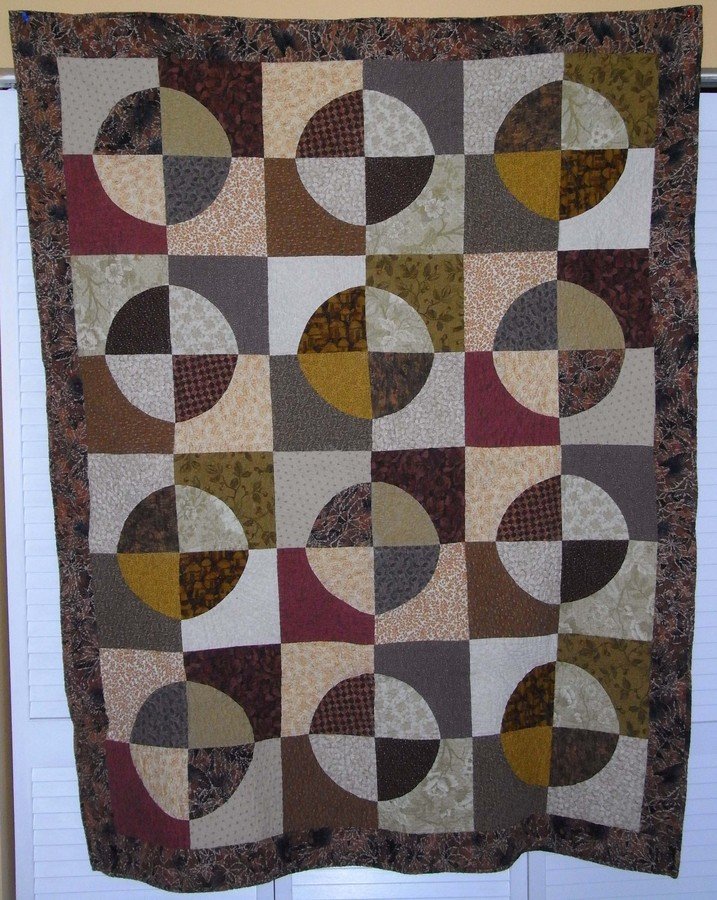 lindabn Circles - I wanted to practice making circles using the freezer paper method from a Simply Quilts episode. However, I wanted to fracture the circles to make it more interesting so I used the freezer paper method to make large circle blocks and then cut them and rearranged them many times until I chose this very traditional arrangment. This is one of the first quilts I made that wasn't a planned gift. I took it out of the quilt basket in the familyroom to take a picture of it. My granddaughter and I curl up with it on the couch when watching Noggin.