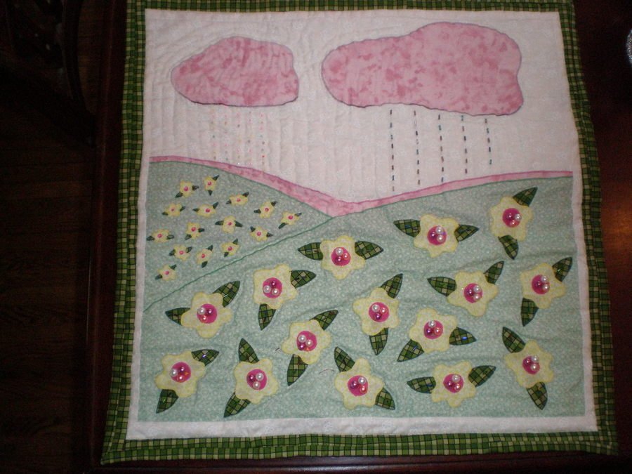 | Design Source - Description | This quilt was made for a Morningstar Quilt Guild challenge. The challenge was to illustrate a saying without using words. The saying I chose is "April showers bring May flowers." |