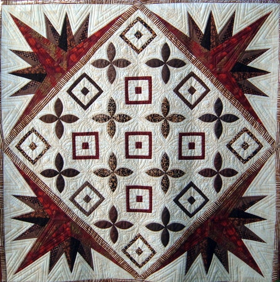 millyka Pacific Liberty - I purhcased the border stripe fabric and this is the quilt that grew as a result. I decided to hand quilt it and spent many hours doing so. I then machine quilted the outside triangles and when it was completed I was disapointed that it did not hang flat. I do have it hanging at home and still do love it.