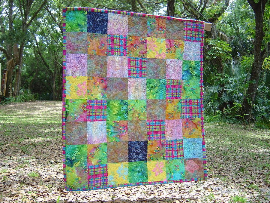 ladyundertheoaks One of Three - This is one of three baby quilts made for one set of twins and cousin: all brand new born August 31 2007 and Oct 19, 2007 (twins -boy and girl). Used mainly batiks with bright colors, fish, frogs and circles. I tried to incorporate some of each fabric into the other quilts while remaining true to the gender of each child. The quilts are approximately 45 x 50 inches. They are very simply made to be used and washed frequently.