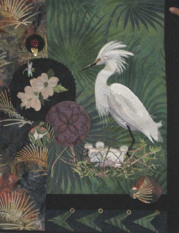 | Design Source - Description | Small Quilt 20-28 with machine embroidered egret on a piece of hand-dyed fabric. |