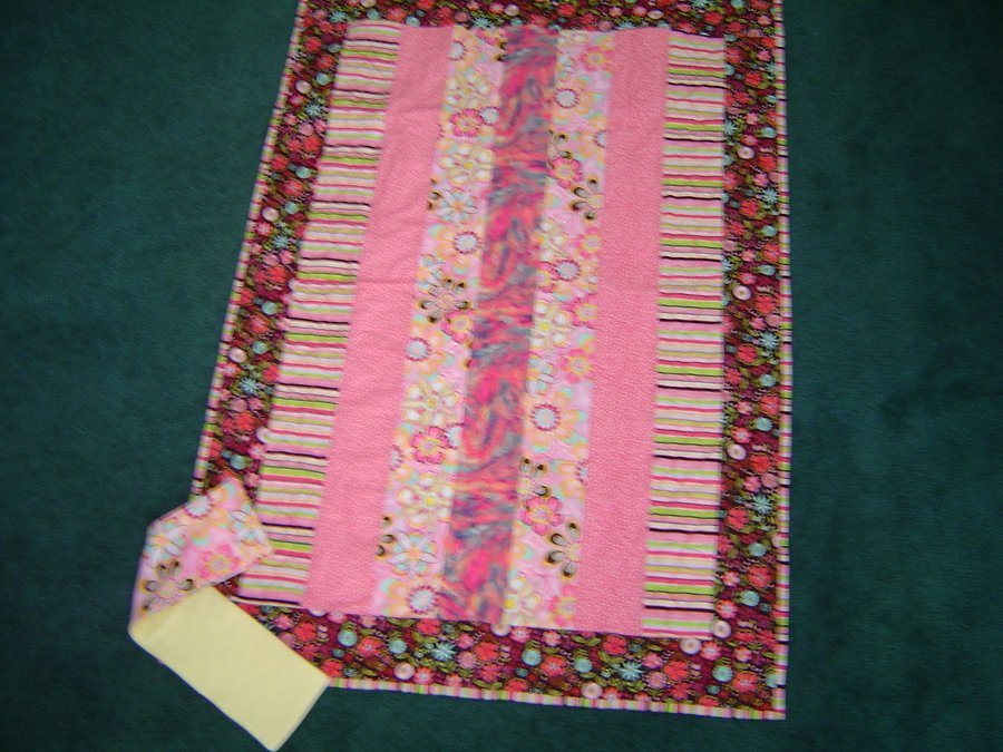 Marla Baby Madeline - This Baby quilt and burp pads are constructed of various 4 1/2 " strips using the baby nursery colors of brown and pink. It is machine quilted with large running flowers down each stripe and the baby's name will be embroidered on the Pink polka dot stripe when the parents agree on how to spell her name.