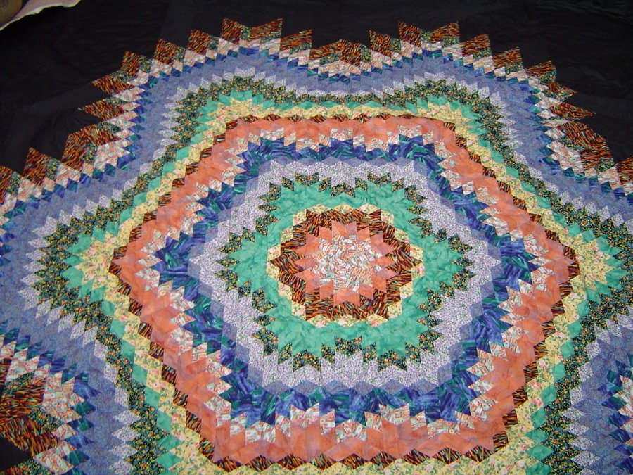 Marla Life's twists and turns - This quilt was begun in 2006 and sat on my sewing table for over a year when I got bogged down with some points that just would not meet correctly. I finally got it out again, determined to be completed. This Queen/King quilt ended up being a monster size at over 100 inches both sides. The only way I could quilt it was to start in the center and work my around and around in waves. Due to the size and weight, the waves are sometimes points thus the name. I discovered while completeing this quilt that I love to piece and now I need to learn to love the quilting process. I am so very pleased with the final look.