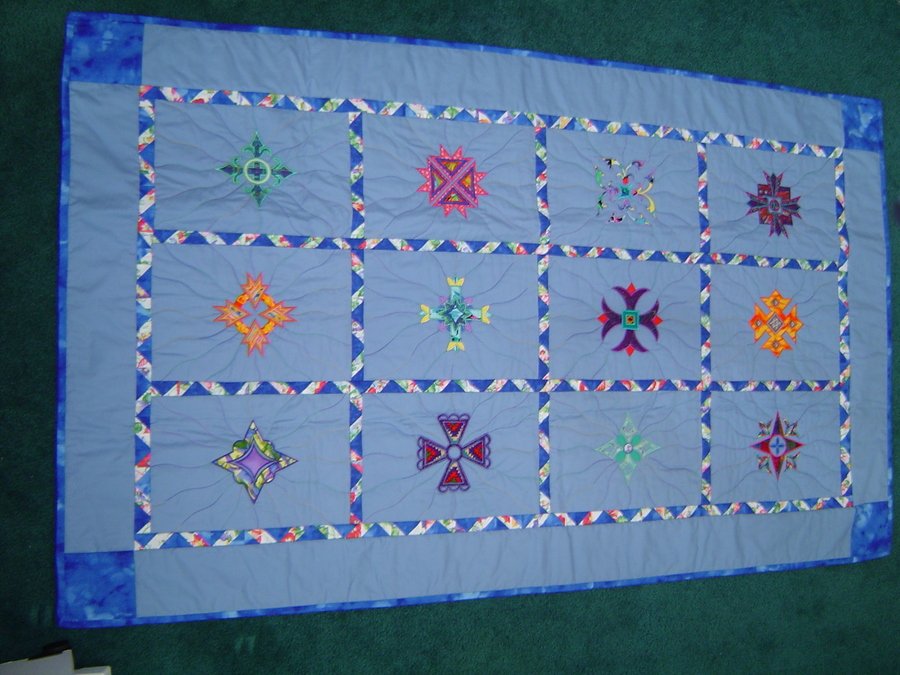 Marla Las Cruces Crosses - This quilt was digitized by Bonnie Rosenbaum and machine appliqued by me using my Bernina 200E Embrodiery module. It was machine quilted using the quilt as you go method. Thangles set off each block using a multi print and multi blue on blue. This lap quilt will be donated to my church school auction New Years.