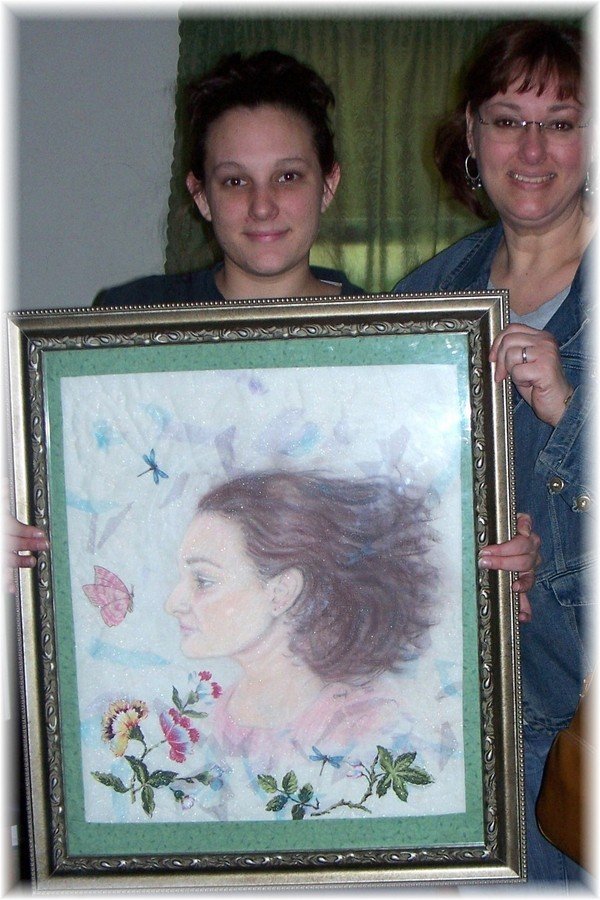 IntuitiveArtist Chera - I made this portrait quilt for my daughter. I used pastels and prismacolor pencils on muslin. I added sparkle tulle on top. Then I appliqued flowers and dragonflies, and added a bead for her earring.