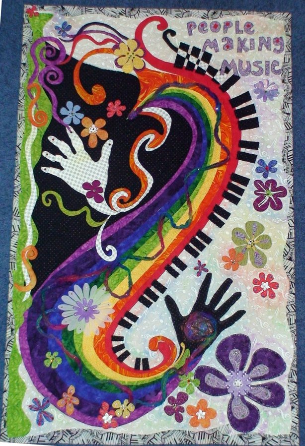 Musicmaker Musicmaker 1 - I decided to take the plunge and make a wallhanging with a musical theme (for hanging in my piano teaching studio) completely from scratch. This quilt is the result. I'm not sure I like the busy-ness of it - but after all, it reflects what's going on in my head. I ventured into watercolors, embellishments, free motion, fused binding, hot fix crystals.