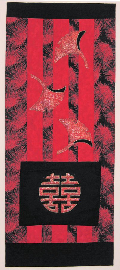 jpotteraz Double Happiness - The symbol at the bottom of the quilt is the Double Happiness symbol. The quilt was a wedding gift to the Petersons from me. The Gingko leaves are trapuntoed and are couched with gold yarn. The quilt is faced rather than bound.