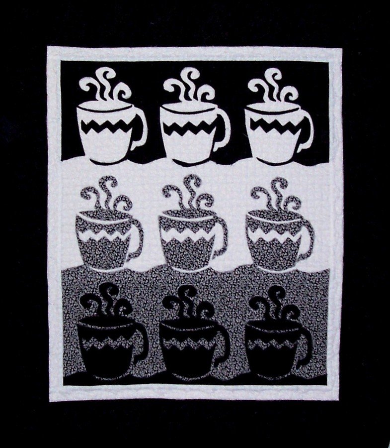 JANBLOCK Coffee Cups - This is a positive-negative pattern quilt of coffee cups made for my daughter-in-law birthday as she owns a coffee shop. The cups are appliquéd. I stitched around the appliqué and used grid quilting on the inside and coffee cups stitching on the borders.