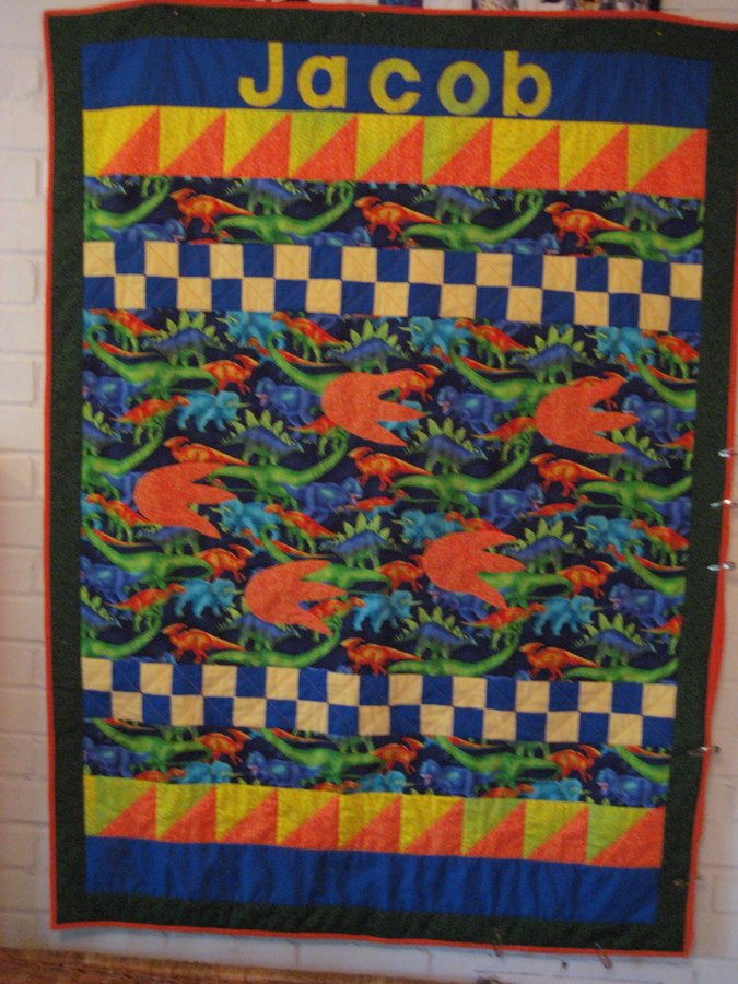 | Design Source - Description | Dinosaur foot prints appliqued across the middle of large print. Stitched in the ditch and across checked board pattern. |