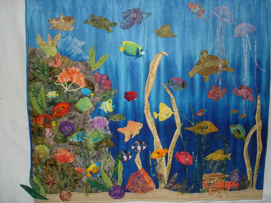 | Design Source - Description | An under sea reef with fish, sea weed and turtles. Embellished with beads, yarn, crystals and shells. The pieces are hand appliqued and the quilt is machine quilted. |