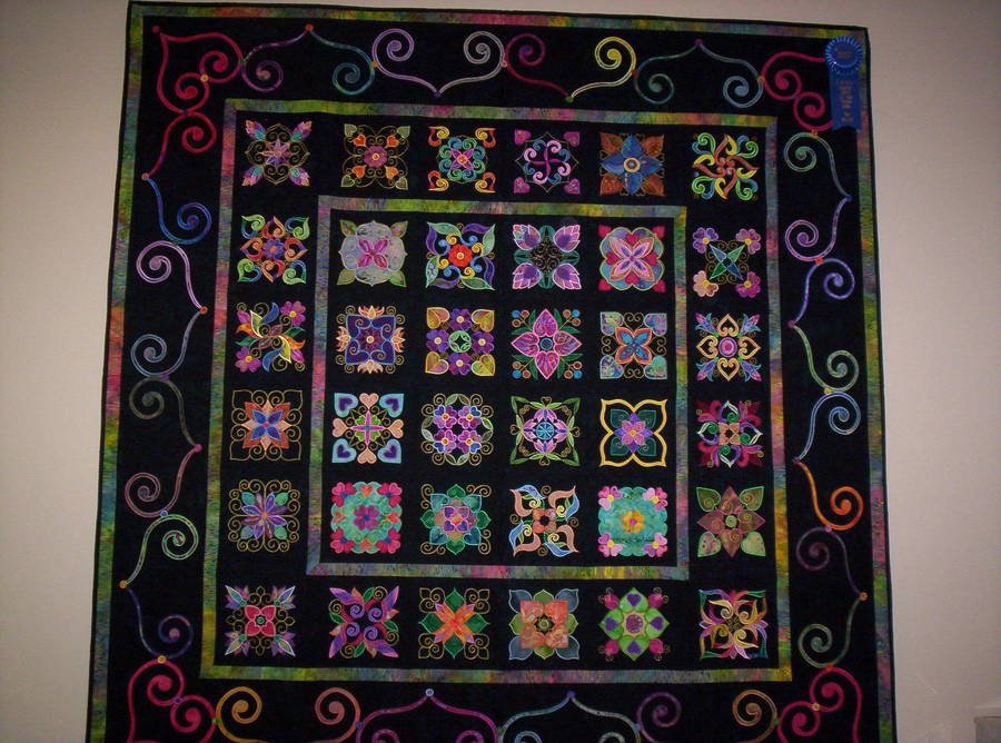 | Design Source - Description | Appliqued Hearts and florals intertwine on a dark background to produce a kaleidoscope of color. Each of the 36 blocks contains a heart motif. |