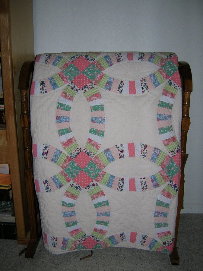 AzBornDesigns Double Wedding Ring - This is a treasure found at a garage sale. It looks like 1930s fabric to me, but I'm not an expert. The batting feels like wool.